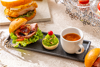 ローストビーフとフォアグラのミニバーガーやツリー仕立てのマッシュポテトなどのセイボリーとともに、