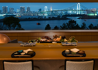 目の前にレインボーブリッジや東京湾の行き交う船が見えるパノラマウィンドウを完備した隠れ家のような店内は、カウンター10席のみ。