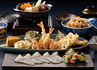 車えびをはじめ魚介や季節野菜を、絶妙な揚げ加減で目の前で調理。オリジナルの揚げ油は、サクサクとした食感でありながらも重さを感じさせないので女性でも気軽にお召し上がりいただけます。